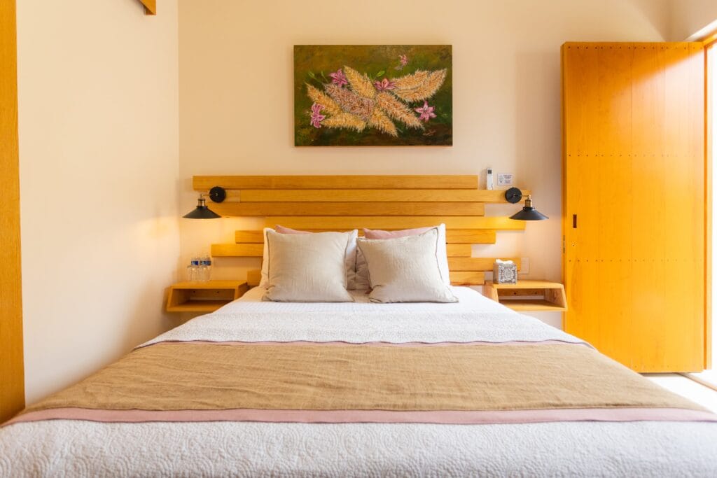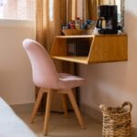 Serenidad y confort con un diseño sofisticado en tonos beige, rosa y madera clara.